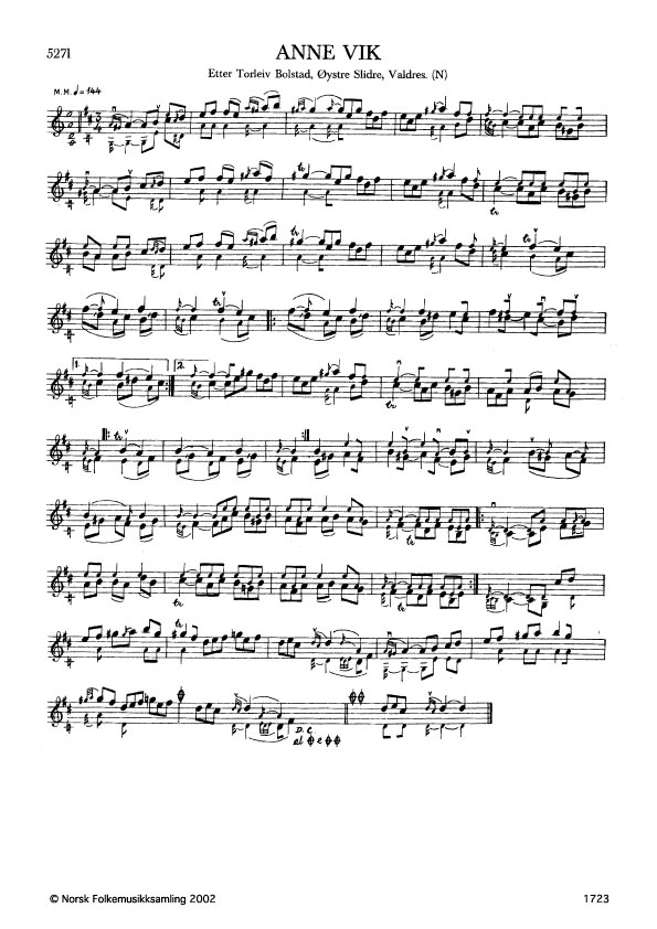 Anne Vik. Etter Torleiv Bolstad, Øystre Slidre, Valdres. N. 1976. Td. 1650. Bolstad lærte slåtten av Ola Okshovd, Øystre Slidre. Andre variantar: G. 1398, etter Olav Moe. jfr. B. 1116 og G. 647.