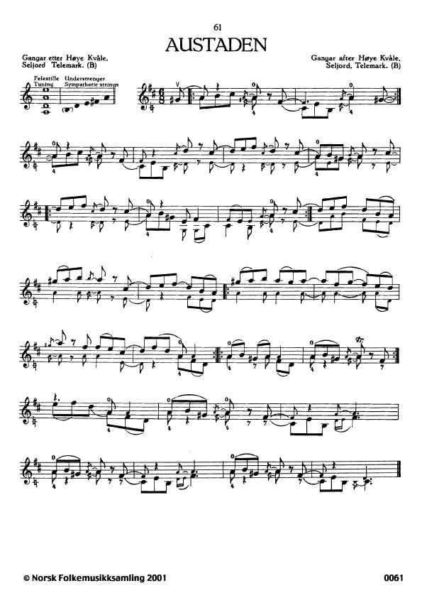 (Austaden) B. 2391. Oppskr. 1950. Kvåle høyrde slåtten av foreldra sine, Anne og Eivind Kvåle. Dei hadde lært han hos Asmund Nordgard, Åseral, Setesdal. Namnet etter Tarkjell Aslakson, Austad, Setesdal.