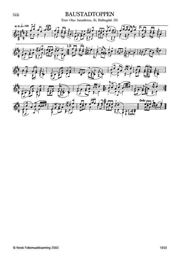 Baustadtoppen. Etter Olav Sataslåtten, Ål, Hallingdal. N. 1976. Td. 783. Sataslåtten sa at han laga slåtten sjølv, men han har nytta gamalt tilfang. Baustadtoppen ligg innpå åsen sør for Torpo. Sataslåtten fortalde at han hadde gått og leita etter sauene sine heile dagen. Trøytt og sliten sat han og kvilde på Baustadtoppen. Då høyrde han bjølla nedi lia. Gløymt var slitet. Han sprang nedetter og tralla denne slåtten. (Truls Ørpen og Magne Myhren). Andre variantar: Ø. 505, etter Olav Sataslåtten.
