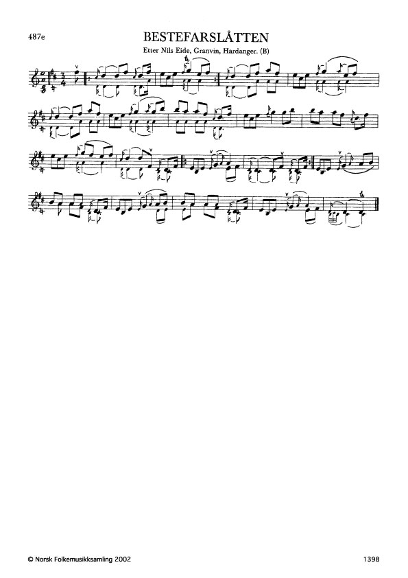 Bestefarslåtten. Etter Nils Eide, Granvin, Hardanger. B. 1096, 1934. Nils Eide, som vart kalla Tråen, hadde lært slåtten av Lars Røynstrand, Granvin. Ola Mosafinn, Voss, spela og denne slåtten. Andre variantar: Ø. 377,Jåle-Ragnhild, etter Gj. Haugen; G. 361, Morten Såldbindar, etter E. Smedal, jfr. Nordbø 132.