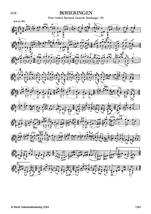 Bøheringen. Etter Anders Kjerland, Granvin, Hardanger. N. 1975. Td. 1488. Kjerland hadde forma slåtten etter fleire: Far sin Severin Kjerland, Nils Eide (Tråen), Halldor Meland, men og etter Ola Mosafinn.