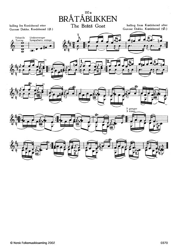(Bråtåbukken) Ø. 111. Oppskr. 1922. Dokka hadde slåtten etter faren Knut D., og denne etter Knut Fosslia, Krødsherad. Ein spræk hallingdansar, Gudbrand Urmakarbråten, måtte alltid ha denne slåtten når han dansa. I dansen mekra han som ein bukk, og kalla seg sjølv "Bråtåbukken" som og vart namnet på slåtten.
