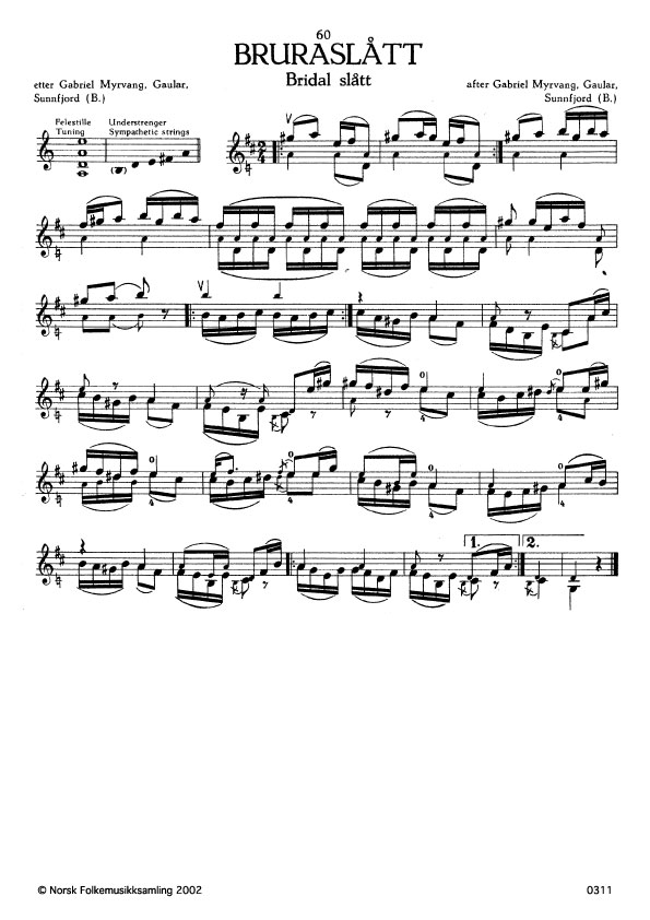 (Bruraslått) B. 1273. Oppskr. i 1930 åra. Myrvang lærde slåtten av Mads Bringeland som atter hadde han frå Gunnar Lundekvam. Fyrste taket ligg opp til fyrste taket i Førnesbrunen, og det siste taket minner litt om Scharts oppskrift av "Tak 'o far min". (Schart nr. 2) .