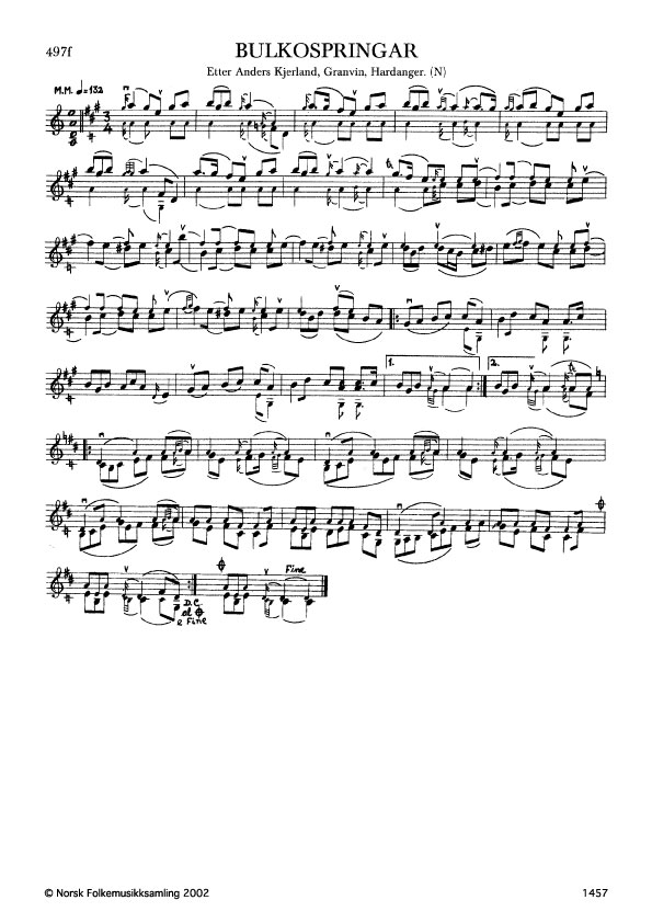 Bulkospringar. Etter Anders Kjerland, Granvin, Hardanger. N. 1974. Td. 1369. Jfr. G. 1218. Kjerland lærde slåtten av Halldor Meland, Espe i Sørfjorden. Slåttenamnet etter spelemannen Per Bulken, Isberg i Sørforden, Hardanger. Andre variantar: Ø. 249, etter K. Bjørnsen.
