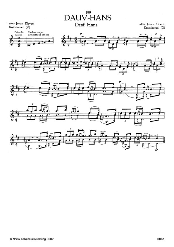 (Dauv-Hans) Ø. 124. Oppskr. på lag 1920. Kleven hadde slåtten etter far sin, Ola Helgesen Kleiva (Gammelkleven). Slåttenamnet etter ein omreisande spelemann kalla Dauv-Hans, som óg bøtte garn og dreiv med ymse arbeid. Han spela gjerne denne slåtten. Slåttenamnet, sjå B. s. Trad. 1/342. Numedalslagets årbok nr. 11, 1925, s. 34.