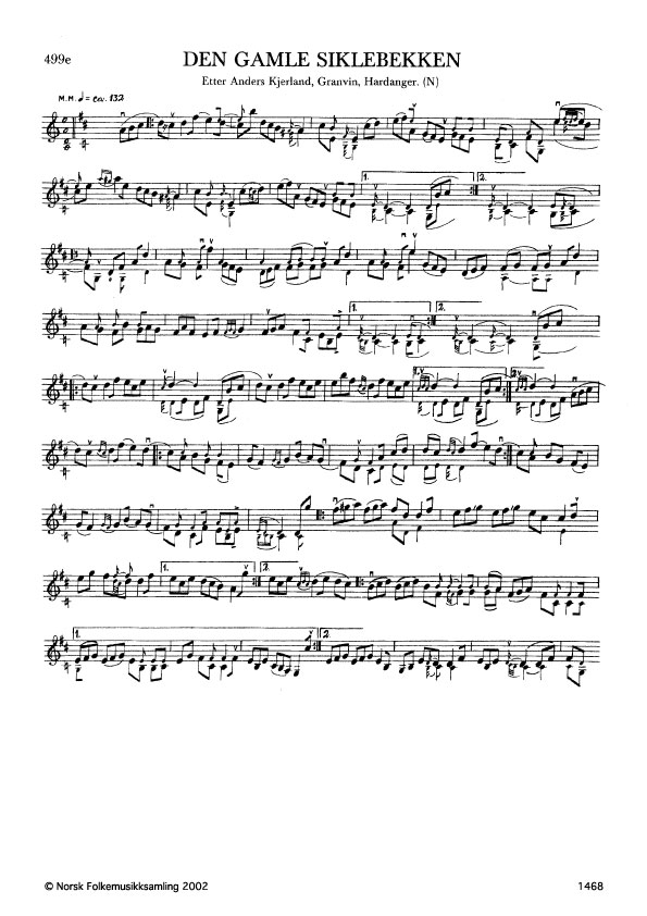 Den gamle Siklebekken. Etter Anders Kjerland, Granvin, Hardanger. N. 1976. Td. 1490. Jfr. Ørpens oppskrift nr. 312 i band 5. Kjerland lærde slåtten av Halldor Meland, Espe i Sørfjorden. Siklebekken har vore spela i Hardanger sidan Myllarguten sine opphald på Vestlandet. Ein kar skulle ha sagt til Myllarguten at han tykte slåtten minte om ein bekk. Då svara Myllarguten: "Den skal bli til ein bekk au, denne". (Anders Kjerland).