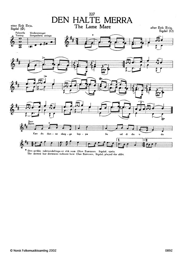 (Den halte merra) Ø. 319. Oppskr. 1937. Det skal vera Knut Fossli som har laga slåtten. Han spela i eit bryllaup, og brurfylgjet reid til kyrkja. Fossli sat på ei halt merr, og han laga slåtten medan han reid. Haltinga kjem fram i stevet ved synkoperingar, trykk på andre slaget i takta. Dette svipar då inn på masurkarytme, medan slåtten har mist noko av dette, av di trykket kjem på fyrste slaget i takta.