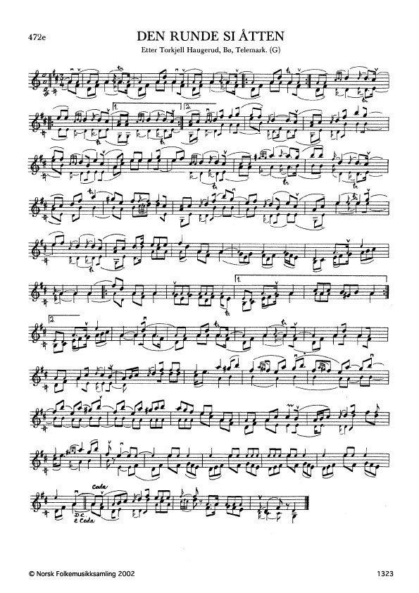 Den runde slåtten. Etter Torkjell Haugerud, Bø, Telemark. G. 1363, 1961. NRK magn. 595. Jfr. Ø. 210 og B. 158. Slåttenamnet av di slåtten liksom går i ring utan tydeleg slutt.