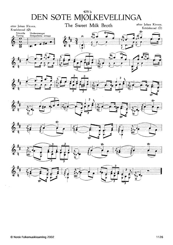 (Den søte mjølkevellinga) Ø. 17. Oppskr. 1921. Kleven hadde slåtten etter far sin, Ola Helgesen Kleiva (Gammelkleven), Krødsherad, som hadde lært han av Knut Fossli. Namnet truleg etter eit slåttestev.