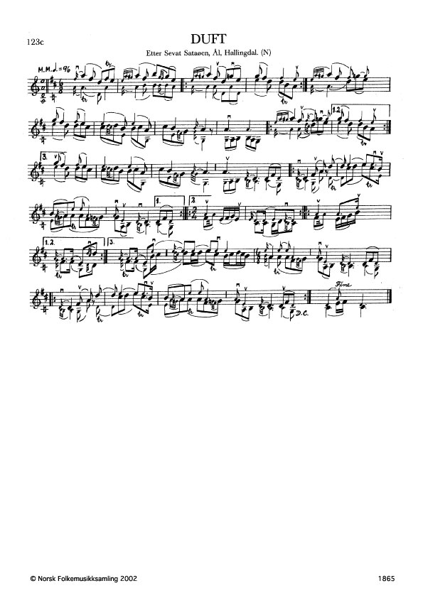 Duft. Etter Sevat Sataøen, Ål, Hallingdal. N. 1978. Td. 674. Både Ola Dekko, Ål og Tor Grimsgard, Nes, nytta denne slåtten mykje. Jfr. band 1 nr. 107.