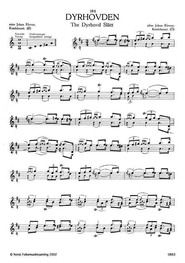(Dyrhovden) Ø. 75. Oppskr. 1925. Kleven hadde slåtten etter far sin, Ola Helgesen Kleiva (Gammelkleven). Slåttenamnet etter ein gamal spelemann, Dyrhovd, Krødsherad.