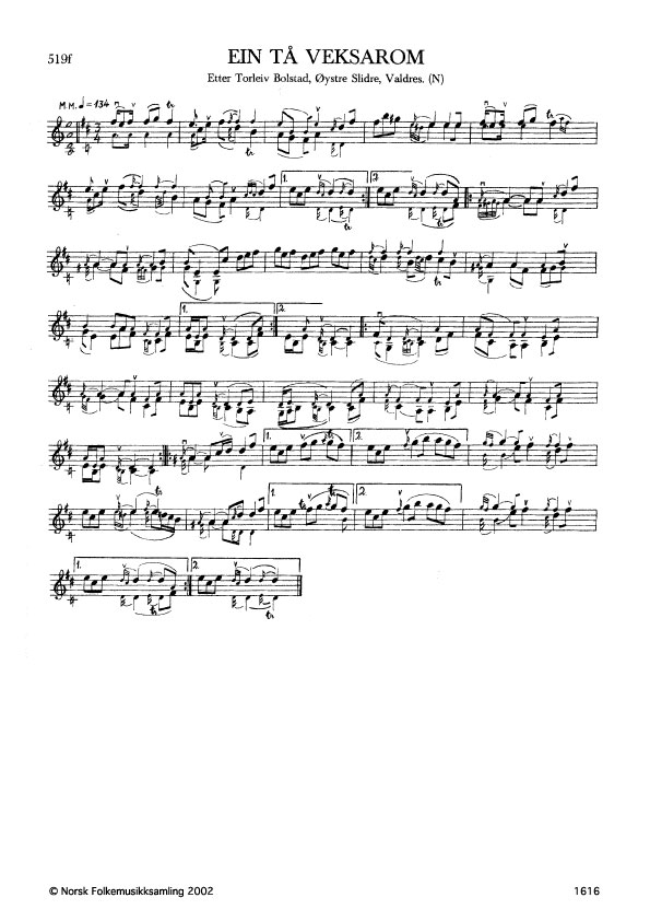 Ein tå veksaro. Etter Torleiv Bolstad, Øystre Slidre, Valdres. N. 1975. Td. 1460. Forma er etter Ola Fystro. Bolstad meinte det var O. Fystro som laga det siste veket i slåtten. I 519e er ikkje dette veket med.