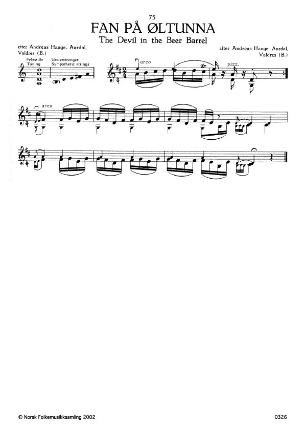 (Fan på øltunna) B. 2139. Oppskr. 1947. Hauge hadde lært slåtten av mor si som spela han på langleik. Ho fekk fyrste premi på den fyrste kappleik for gamalt langleikspel, Fagernes, Valdres 1884. Far till Hauge hadde fortalt at slåtten hadde fan spela medan han sat på ei øltunna. Han som kom og skulle tappe øl, sprang oppatt or kjellaren med tunnetappen i neven så ølet rann ut, men da han vaga sjå nedatt, var mannen på øltunna borte. B.s. Tradisjon Valdres, s. 151.