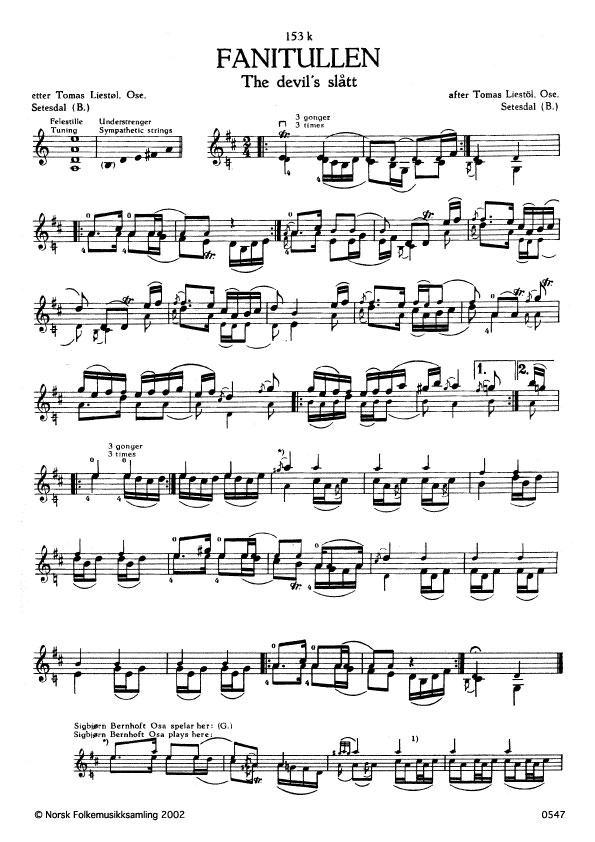 (Fanitullen) B. 171. Oppskr. 1917. Liestøl hadde fått slåtten av Knut Heddi, Rystad, Setesdal, som atter hadde han frå Nils Horvaråk, Åraksbø. Sjå G. 1060. Denne slåtten har ingen ting sams med den vanleg velkjende Fanitull-slåtten frå Hallingdal.