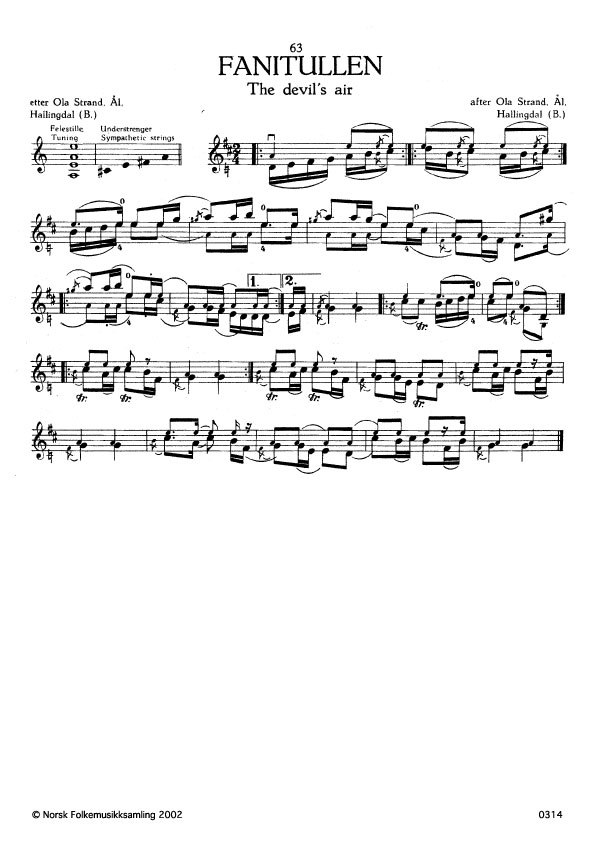 (Fanitullen) B. 1287. Oppskr. 1938. Strand høyrde slåtten av Asle Øyno d.e., Ål, som kalla han "Fanitullen". Det var noko omframt med denne slåtten, noko mandig og norsk, serleg med seinste taket. Dei dansa han helst når dei var i godlåt. Takt 18-24 svipar litt inn på den vanlege Iydarslåtten "Fanitullen". Det kan henda at dette er ei svært gamal form av sume tak i den nemnde Iydarslåtten, men denne hallingen etter Strand må reknast som ein sjølvstendig slått.