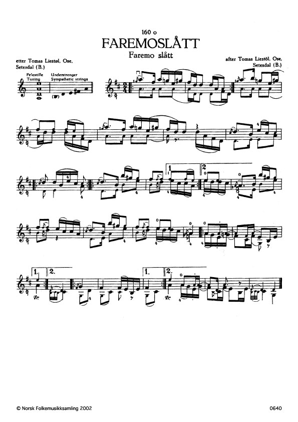 (Faremoslått) B. 391. Oppskr. 1917. Liestøl har slåtten etter Jørund Frivoll, Hægeland, Setesdal. Denne hadde han beinveges frå Olav Faremo, Hylestad, Setesdal, som slåtten har namn etter.