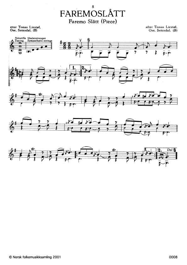 (Faremoslått) B. 393. Oppskr. 1917. Liestøl hadde slåtten etter Knut Heddi, Rysstad, Hylestad, Setesdal. Slåttenamnet er truleg etter spelmannen Olav Faremo.
