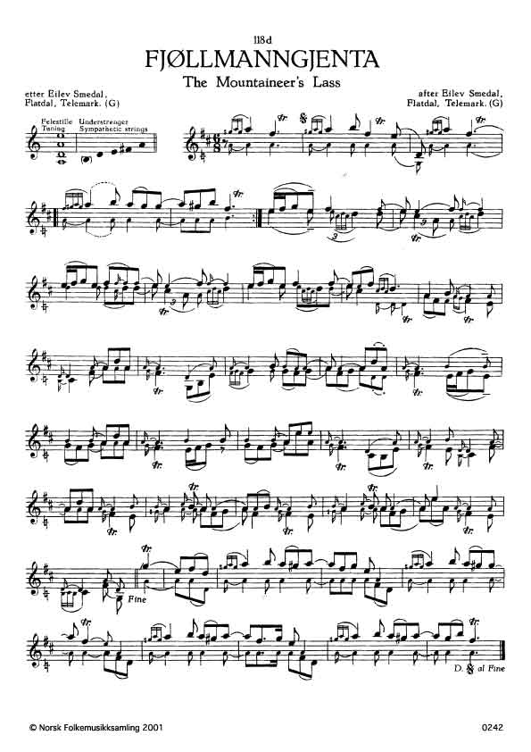(Fjøllmanngjenta) G. 363. Oppskr. 1936. Smedal hadde lært slåtten av Kjetil Håvardson, son til Gibøen, Rauland, Telemark.
