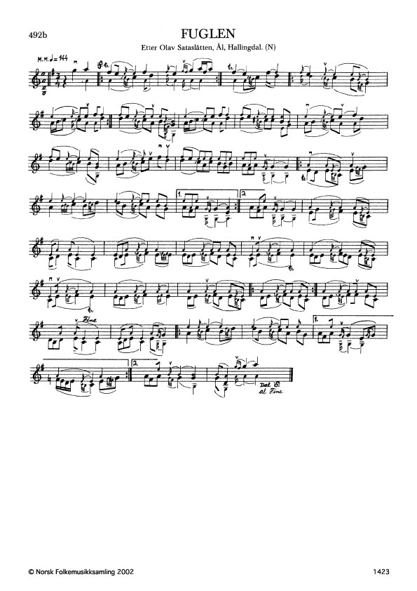 Fuglen. Etter Olav Sataslåtten, Ål, Hallingdal. N. 1975. Td. 687. Jfr. Ø. 508. Sataslåtten hadde denne etter spelemannen Ola Dekko (Gamle-Dekken), Ål.