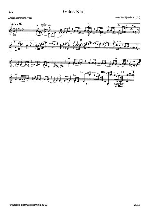 Lærte den i l908. Tippoldefaren skal ha spilt den. Galne-Kari var budeie og ble sinnsvak etter at underjordiske hadde spilt for henne på seterkveen. Siden tralla og sang hun på denne slåtten. Bjørkheim spiller den langsomt og nokså fritt.