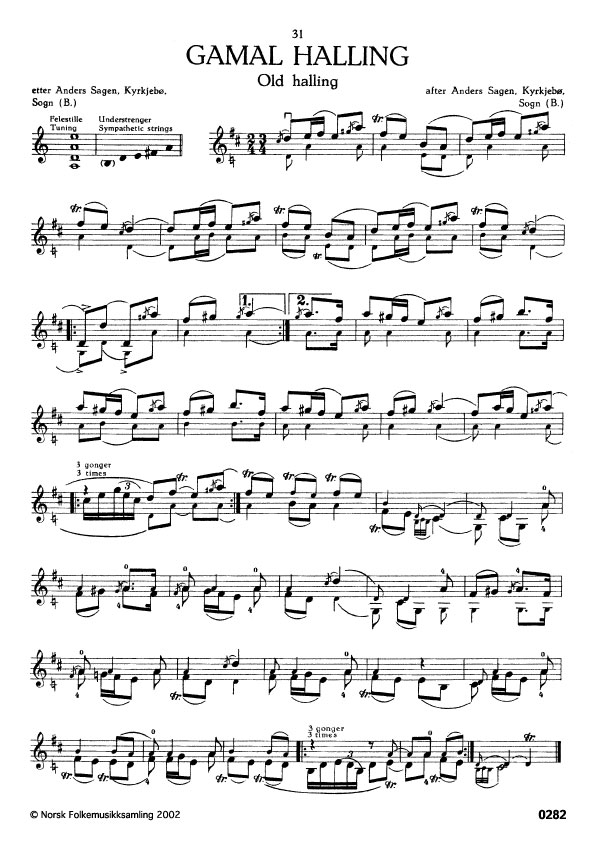 (Gamal halling) B. 640. Oppskr. 1916. Sagen lærde slåtten 1848 av Rognald Berge som truleg hadde lært han av "Gamlehagen" (Anders Hagen) på Voss.