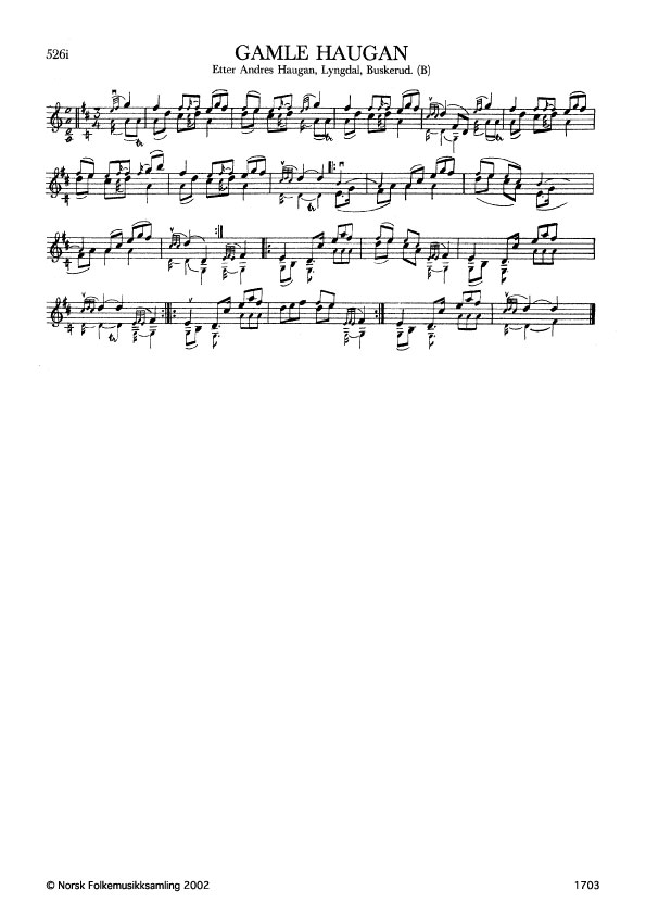 Gamle Haugan (Skeimakaren). Etter Andres Haugan, Lyagdal, Buskerud. B. 100, 1937. Haugan lærte slåtten av far sin, Ola Haugan (1854-1907). Han hadde slåtten etter Eivind Spellemann, Flesberg. Jfr. B. 27.