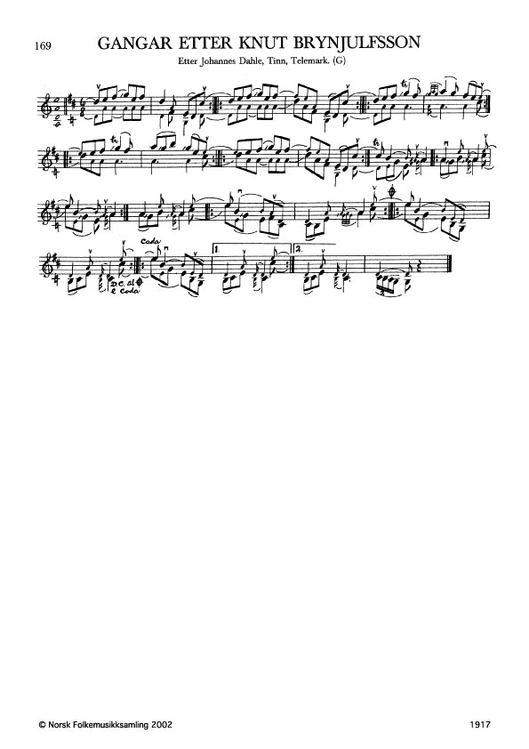 Gangar etter Knut Brynjulfsson. Etter Johannes Dahle, Tinn, Telemark. G. 1875, 1970. NRK magn. 2072, og Td. 1736. Knut Brynjulfsson Sønstaul (1771-1863) var son til stenderspelemann Brynjulf Olsson og godfar til Knut Dahle, som igjen var godfar og første læremeister til Johannes Dahle.