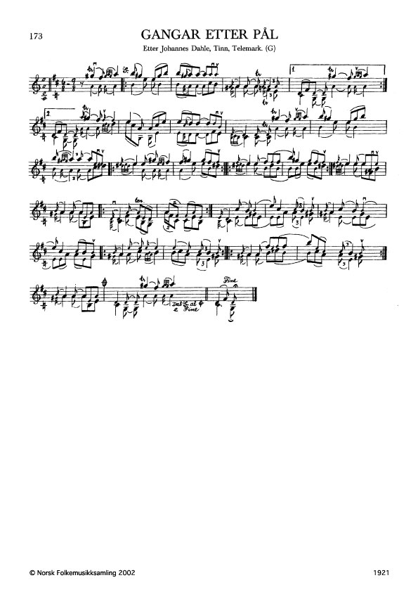 Gangar etter Pål. Etter Johannes Dahle, Tinn, Telemark. G. 1871, 1970. NRK magn. 1983. Pål er Pål Løytnantsdreng frå Numedal, f. 1786, død i Amerika 1867 (Bj. Bratås). Jfr. band 1 nr. 32. Om Pål sjå band 1 nr. 73.