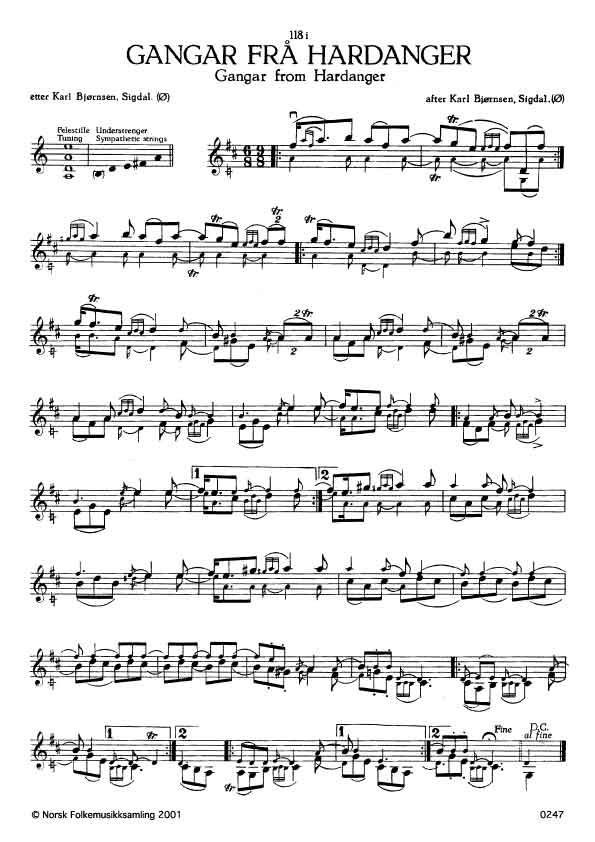(Gangar) Ø. 302. Oppskr. 1947. Slåtten finn ein fyrst hos Eirik Selland, Granvin. Bjørnsen lærde han av Kristiane Lund, Bø, Telemark.