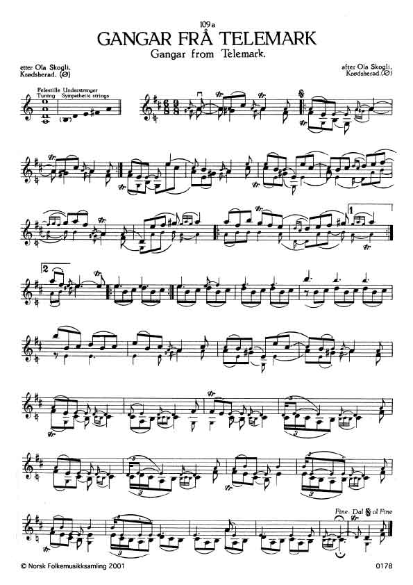 (Gangar) Ø. 105. Oppskr. 1920. Skogli hadde slåtten etter Torgeir Torgeirson, son til Myllarguten. 109a-e er variantar.