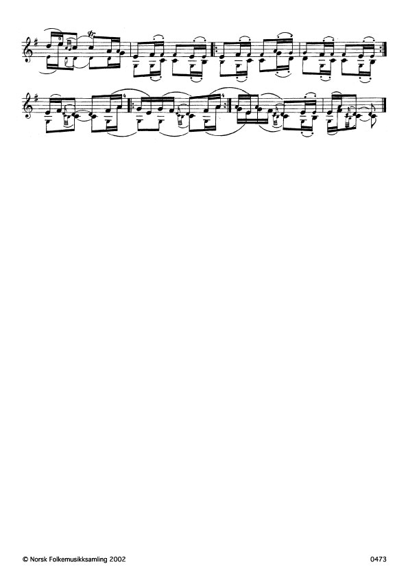 (Gangar) Ø. 496. Oppskr. 1952 etter privatopptak frå sending i NRK. A. Rysstad hadde slåtten frå Halvard R. som atter truleg hadde han frå Petter Veum, Fyresdal. Knut Heddi trudde slåtten var ein kivlemøyslått.