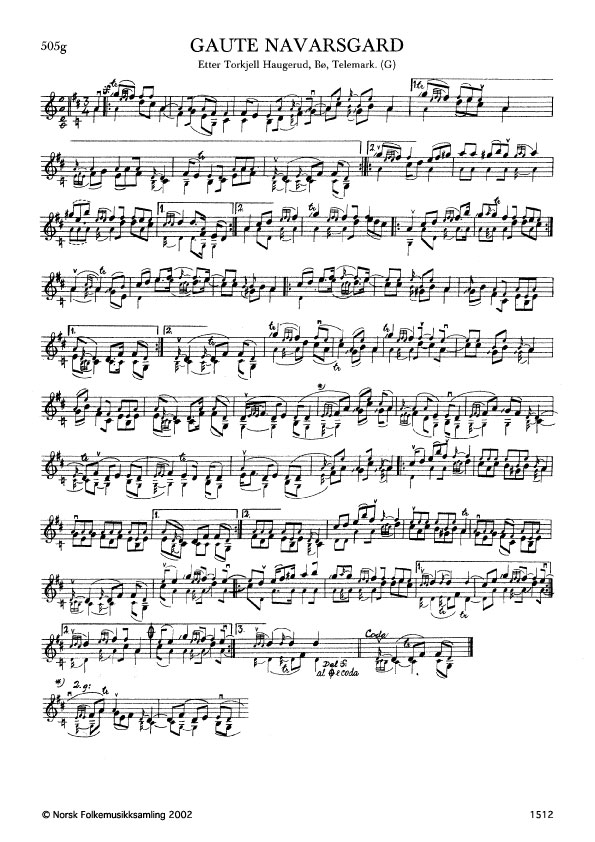Gaute Navarsgard. Etter Torkjell Haugerud, Bø, Telemark. G. 1364, 1961. NRK magn. 2577. Jfr. Ø. 228 og G. 1288. Andre variantar: B. 135 etter G. Borgen; B. 102 etter A. Haugen.