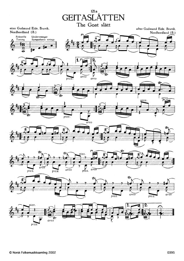 (Geitaslåtten) B.N.S1. 48. Oppskr. 1916. Eide lærde slåtten 1898 av Ola Mosafinn, Voss. Jfr. Schart nr. 8. Lindeman nr. 427 og 548. Sjå Arne Bjørndal. "Fanitullen eller Daudingen" i Spelmannsbladet 1951 nr. 1, s.8-11 og Truls Ørpen."Fanitullen" ibid. nr.2, s. 10. Andre namn på slåtten er "Kjerringa i drivsnøen", "Strilen", "Killebukken", "Den vonde på snøfonni", "Teledropen". Geitaslåtten vart i Vik, Sogn, nytta som grautaslått. B.s. Ymis tradisjon etter O. Andr. Brække 1940, s. 31a. Grautaslått var den slåtten dei spela når grauten vart sett på bordet i brudlaup.