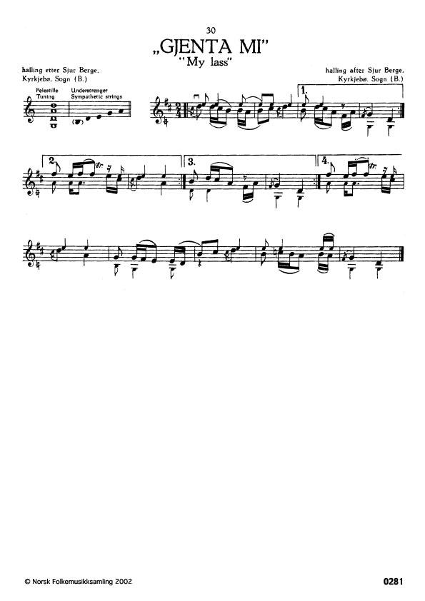 (Gjenta mi ) B. 542. Oppskr. 1917. S. Berge lærde slåtten 1870 av Per Berge, Kyrkjebø, som var 84 år gamal i 1916. Til slåtten finst rimet: "Kar ha' du vore og kar ve' du av, kar ha' du vore so lengje? Eg ha' vore hjå gjenta mi, dar ha' eg sove for lengje".