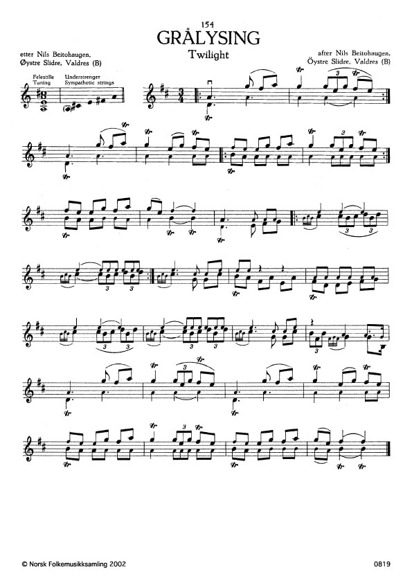 (Grålysing) B. 623. Oppskr. 1912. Beitohaugen hadde lært slåtten i 1890 av Jørn Røn, Vestre Slidre, Valdres. I Sogn og Valdres vart dei slåttane dei spela om morgonen då gjestene fekk mat og skjenk på senga, kalla for grålysingsslåttar. På Voss kalla dei slike slåttar for nøringane, nøringsslåttar. Nøring = næring.