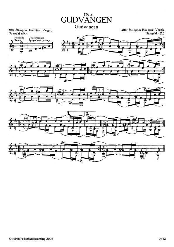 (Gudvangen) Ø. 164. Oppskr. 1924. Haukjem hadde slåtten etter Halvor Høiset, Hovin, Tinn, Telemark. Slåttenamnet er etter spelmannen Per Gudvangen, Aurland, Sogn. Han vart og kalla Lisbet-Per. Mange slåttar har fått namn etter han, men dei er ikkje alltid i slekt med kvarandre.