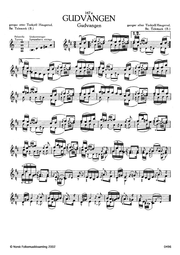 (Gudvangen) B. 2441. Oppskr. 1950. Haugerud hadde slåtten etter Knut Dale, Tinn, Telemark, som atter hadde han frå Håvard Gibøen.