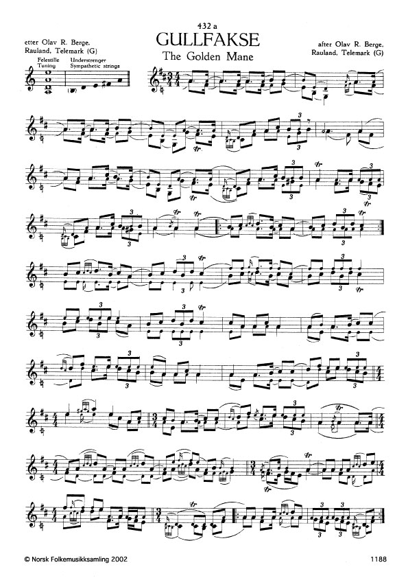 (Gullfakse) G. 732. Oppskr. 1924 etter minne. Faks = mån, manke. Gullfakse gjerne tilnamn på ein sers fager hest, og når slåtten har fått dette namnet er det truleg av di det var ein uvanleg vakker slått. Etter Bjørndal skal det vera same slåtten som "Personvrita" (vrita-som er vrien å spela). Sjå R. Berge: Myllarguten, s. 164. Bjørndal meiner at Myllarguten lærte slåtten på Sekse, Ullensvang, i 1840-50 åra av Per Bulko, Ullensvang. I Hardanger har dei lenge kalla slåtten for "Gullfakse".