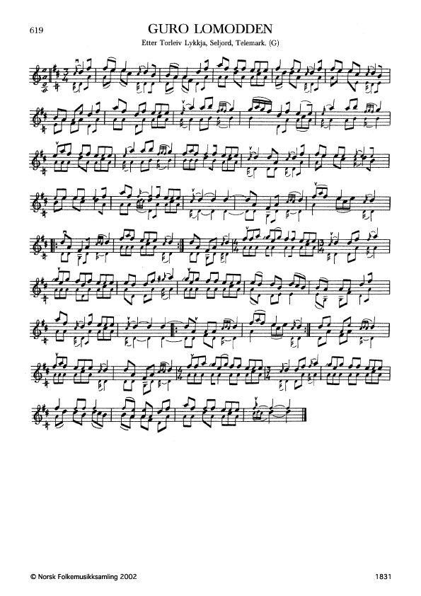 Guro Lomodden. Etter Torleiv Lykkja, Seljord, Telemark. G. 1817, 1970. Lykkja hadde lært slåtten av Gunnar Gotun, Seljord og Torkjell Haugerud, Bø. Jfr. band 5 nr. 437.