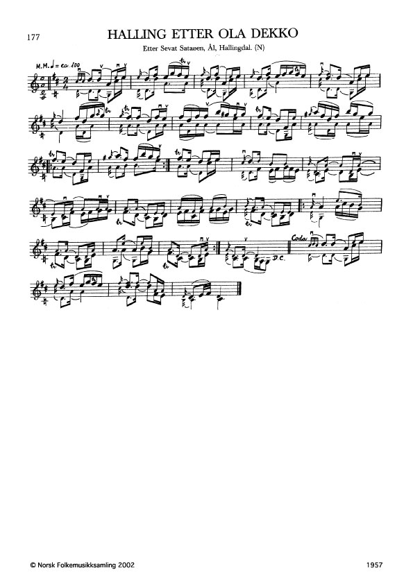 Halling etter Ola Dekko. Etter Sevat Sataøen, Ål, Hallingdal. N. 1978. Td. 1796. Jfr. band 2 nr. 119. Ola Dekko brukte mykje denne hallingen til å spela seg opp på før folket tok til å dansa (Sataøen).