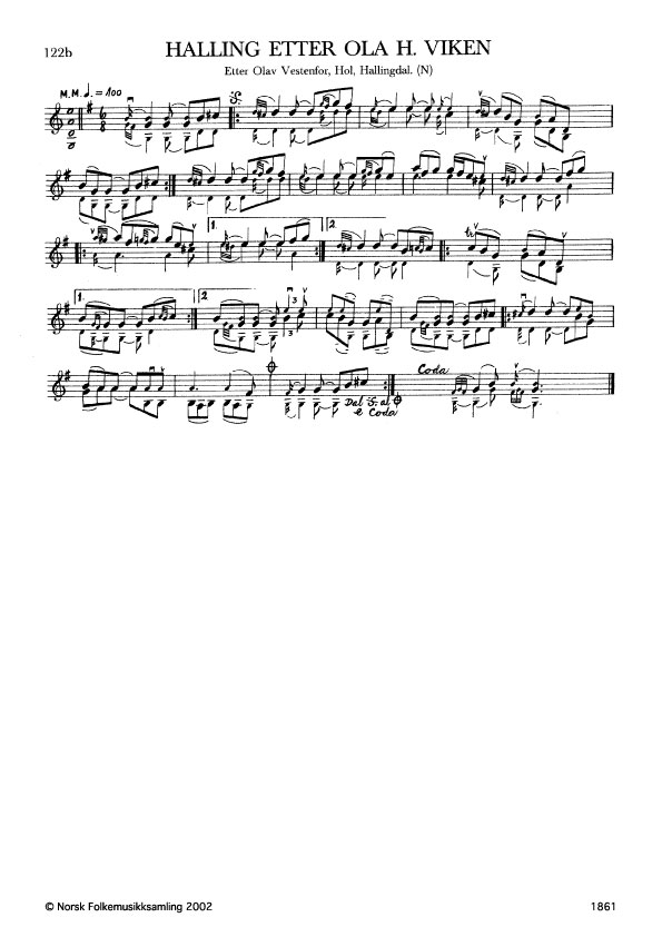 Halling etter Ola H. Viken. Etter Olav Vestentor, Hol, Hallingdal. N. 1978. Td. 1842. Olav Vestenfor lærte slåtten av far sin, Ola H. Viken (1857-1940). Jfr. band 1 nr. 111.