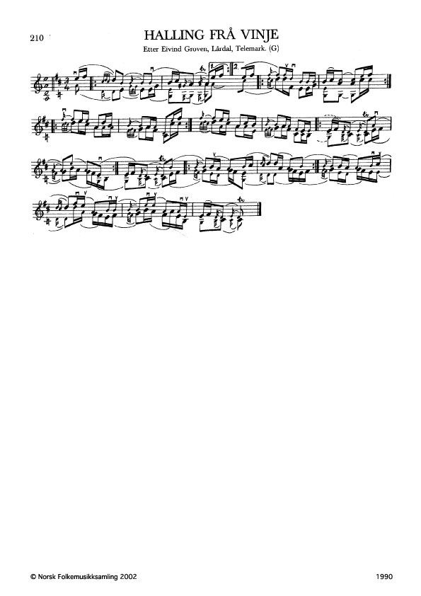 Halling frå Vinje. Etter Eivind Groven, Lårdal, Telemark. G. 1135, 1960. Groven lærte slåtten av broren Olav. Han minner litt om Frøyraken, band 2 nr. 104c.