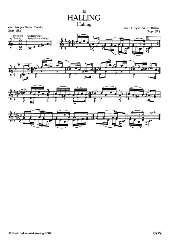 (Halling) B. 538. Oppskr. i 1930 åra. G. Sætre hadde slåtten frå Karl O. Sætre, som døydde kring 1860 på lag 60 år gamal. Gregus lærde slåtten i eit brudlaup på Tredal 1882. Karl hadde han fra ein som heitte Lars Røyrbotn.