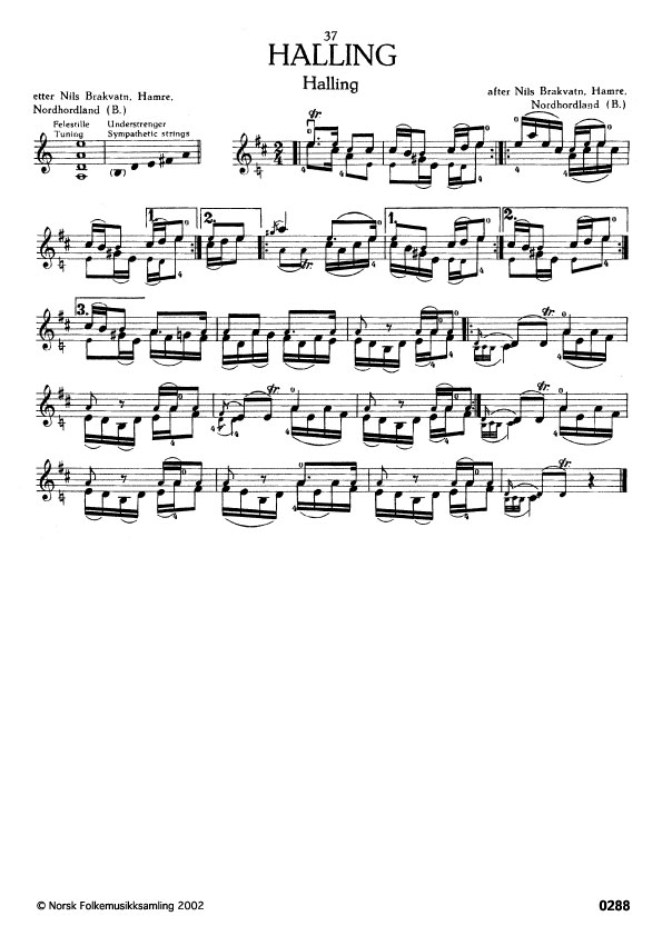 (Halling) B. 876. Oppskr. i 1930 åra. Brakvatn lærde slåtten av John Rivenes, Haus, og denne hadde han truleg frå Ola Tunes ("Und-Ola"). Sjå merknad 38.