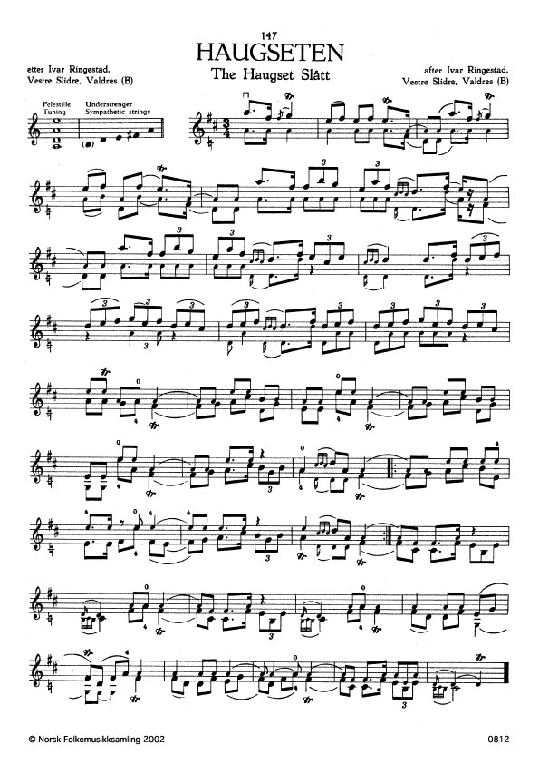 (Haugseten) B. 453. Oppskr. 1912. Ringestad lærde slåtten av Ola Hamresbrøtin, Vestre Slidre, Valdres, som hadde han frå Ola Haugset, Røn, Valdres.