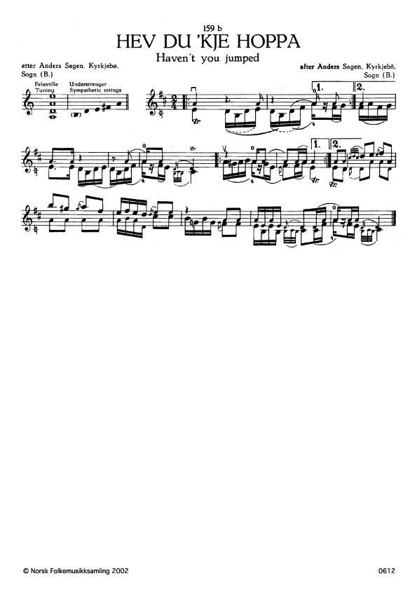 (Hev du 'kje hoppa) B. 533. Oppskr. 1916. Denne hallingen hadde Sagen lært av Sjur Berge, Kyrkjebø, Sogn.