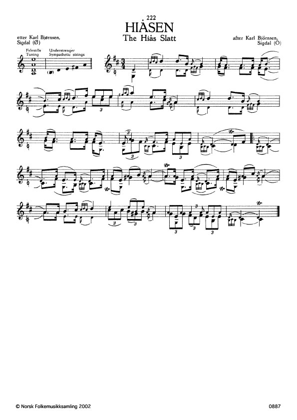 (Hiåsen) Ø. 247. Oppskr. 1939. Bjørnsen hadde slåtten frå Ola Hiås, Sigdal, som slåtten ber namn etter. Fyrste taket er i slekt med eit tak i Nordlendingen frå Telemark.