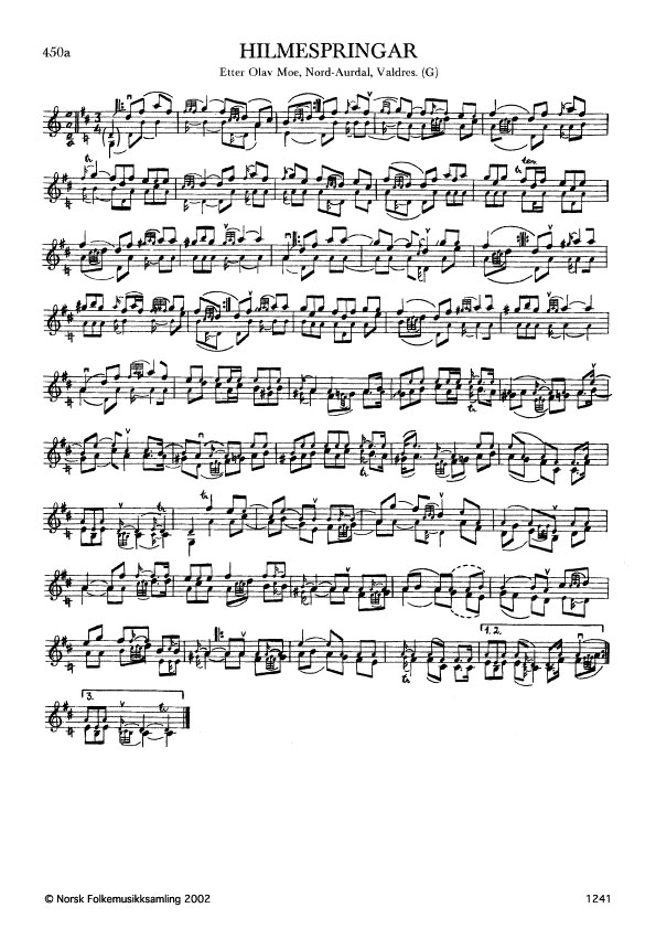 Hilmespringar. Etter Olav Moe, Nord-Aurdal, Valdres. G. 1140, 1959. NRK magn. 990. Slåttenamnet etter Jørn Hilme.