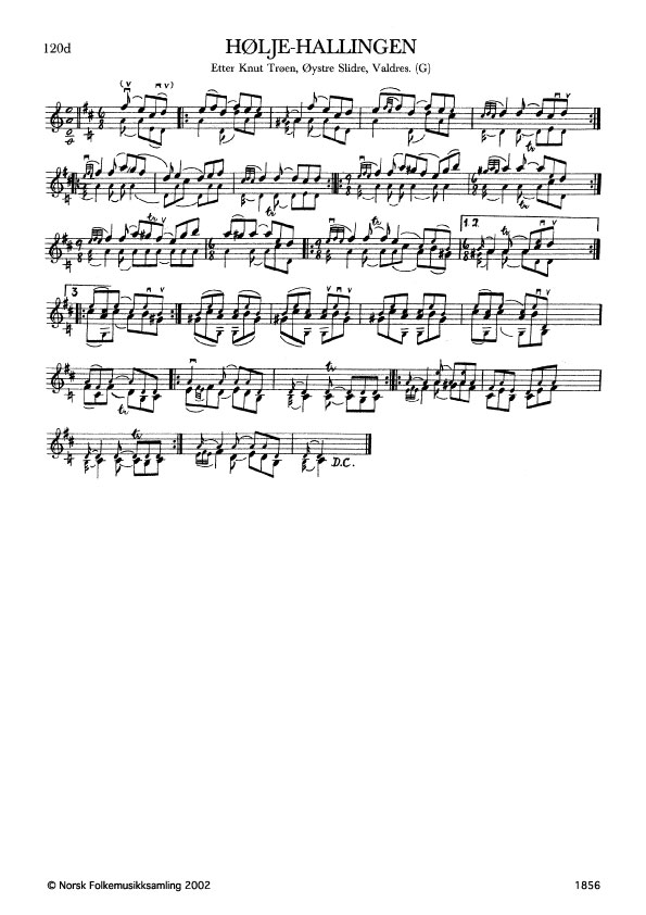 Hølje-hallingen. Etter Knut Trøen, Øystre Slidre, Valdres. G. 1592, 1965. NRK magn. 51237. Trøen lærte slåtten av Gullik Kirkevoll, Vestre Slidre. Slåtten skal vere gamal i Valdres. Han blei truleg spela av Helge Gulliksen Høverstad (1759-1800). Sjå Valdres bygdebok, VI, s. 323, Leira 1968. Jfr. band 1 nr. 114.