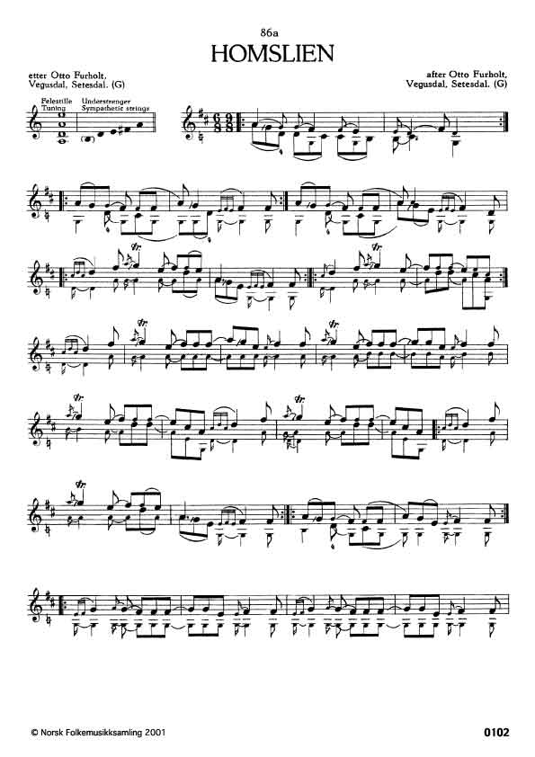 (Homslien) G. 98(). Oppskr. 1953 etter opptak i NRK. 86a og b er variantar. Slåttenamnet er etter kona til spelmannen Tallak Haslebakken, Kristi som var komen frå garden Homslid i Kleivgrend, Fyresdal. I svevne høyrde ho tussane spela slåtten, ho tulla han for mannen og han fela han etter. Så vart slåtten kalla "Homslien". Johs. Skar. Gamalt or Sætesdal V, Kra. 1911.